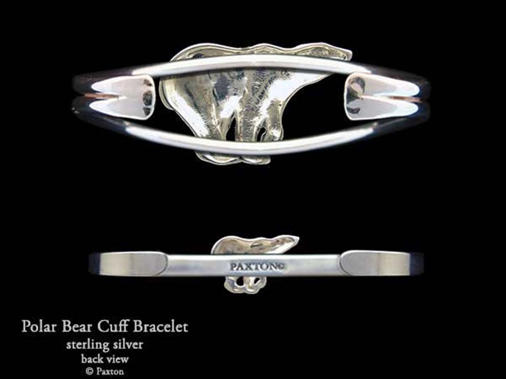 Handmade polar bear cuff bracelet created in all sterling silver by Paxton Mobley. These polar bear cuff bracelets are made to fit a standard wrist size of approximately 6 to 7 inches. If your wrist size is smaller than 6" or larger than 7" please contact me for a custom sized bracelet (one of the listing's images shows how to measure your wrist size). Our beautiful bracelets have an original hand carved sterling silver polar bear mounted on a handmade sterling silver cuff bracelet fabricated out of high quality silver and are available in two styles. The small polar bear carving is on a single flat hand fabricated sterling silver cuff (approx. 5 mm wide x 1.25 mm thick) while the large polar bear carving is on a double round cuff hand fabricated out of sterling silver tubing (tubing is approx. 2.5 mm in diameter). These sterling silver polar bear cuff bracelets are fashionable yet durable and can be squeezed or opened slightly. Like all of Paxton's hand carved and crafted works of wearable art, these sterling silver cuff bracelets come hand signed by the artist Paxton.