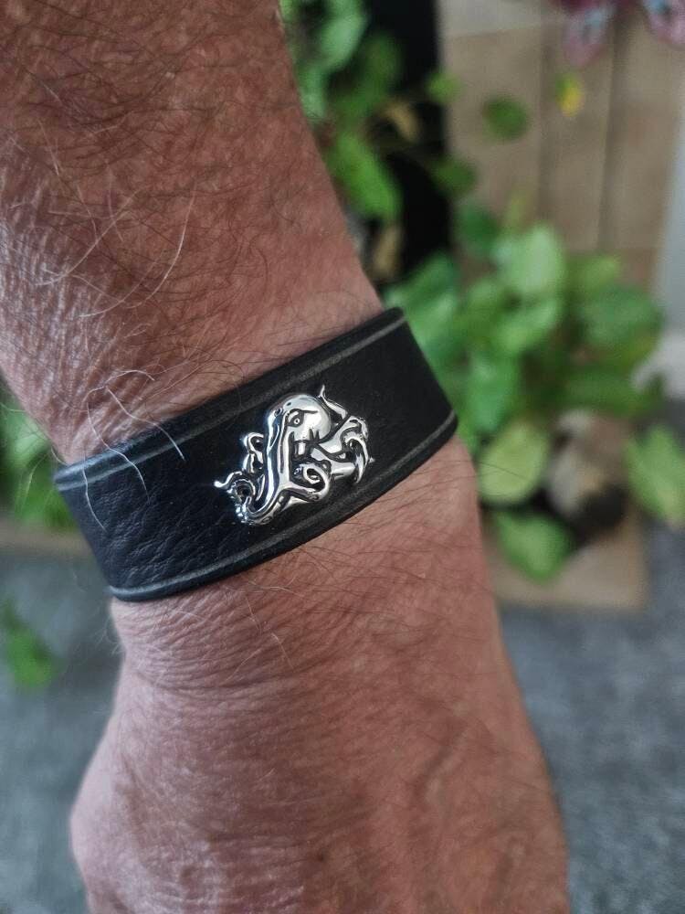 Elegant but sturdy sterling silver octopus key chain / key ring hand carved, cast and fabricated by Paxton. This octopus keychain comes in two styles: A larger octopus carving in all sterling silver and a smaller octopus carving in sterling silver on a handcrafted genuine leather key fob. The larger octopus carving key chain is crafted from fine sterling silver 4mm rolo chain, accented with a hand carved and cast original sterling silver octopus design and then finished with a stainless steel key ring chosen for its durability and everyday use. The smaller octopus carving on leather keychain / keyfob is handmade out of genuine leather, accented with a hand carved and cast original sterling silver octopus design and then also finished with a durable stainless steel key ring. All of our handmade keychains, including these octopus key chains, come hand signed by the artist. Our key chains come packaged in an attractive gift box along with a black velvet storage bag, a zip lock bag with anti-tarnish strip and an about the artist / caring for your jewelry information card.