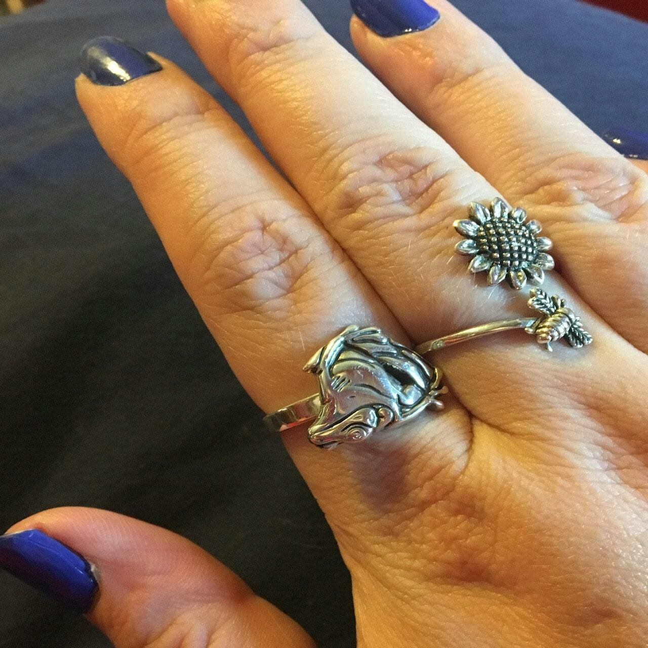 Beautiful hand crafted and cast tree frog #1 ring in sterling silver by artist and designer Paxton Mobley. This original sterling silver tree frog ring is completely handmade from the fine sterling silver band, approx. 3mm wide, to the hand carved and cast sterling silver tree frog #1 design which adorns the ring. All our handmade rings, including this sterling silver tree frog ring, are created from original hand carved designs by Paxton and come hand signed by the artist. Our rings come packaged in an attractive gift box along with a black velvet storage bag, a zip lock bag with anti-tarnish strip and an about the artist / caring for your jewelry information card.