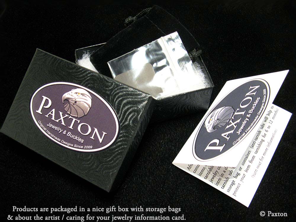 Handmade sterling silver bat on genuine leather bracelet created by Paxton Mobley. This beautiful handcrafted bat bracelet is made from high quality genuine leather that has been cut and finished all by hand and then accented with a hand carved, cast sterling silver bat design. The bracelet is then finished with a leather keeper and black oxide over brass button stud closure. The narrow with small carving bat bracelet is approx. 3/4" wide while the wider large carving bat bracelet is approx. 1 3/8" wide (all bracelets are handmade so might vary slightly in width depending on size of carving being attached). Both bat bracelets come in the 3 main sizes of small, medium or large (each size has three holes for further size adjustment) and can be ordered in the colors of black, chocolate or brown leather. Like all of Paxton's hand crafted and carved works of wearable art, these sterling silver bat leather bracelets come hand signed by the artist. Our bracelets come packaged in an attractive gift box along with a black velvet storage bag, a zip lock bag with anti-tarnish strip and an about the artist / caring for your jewelry information card.